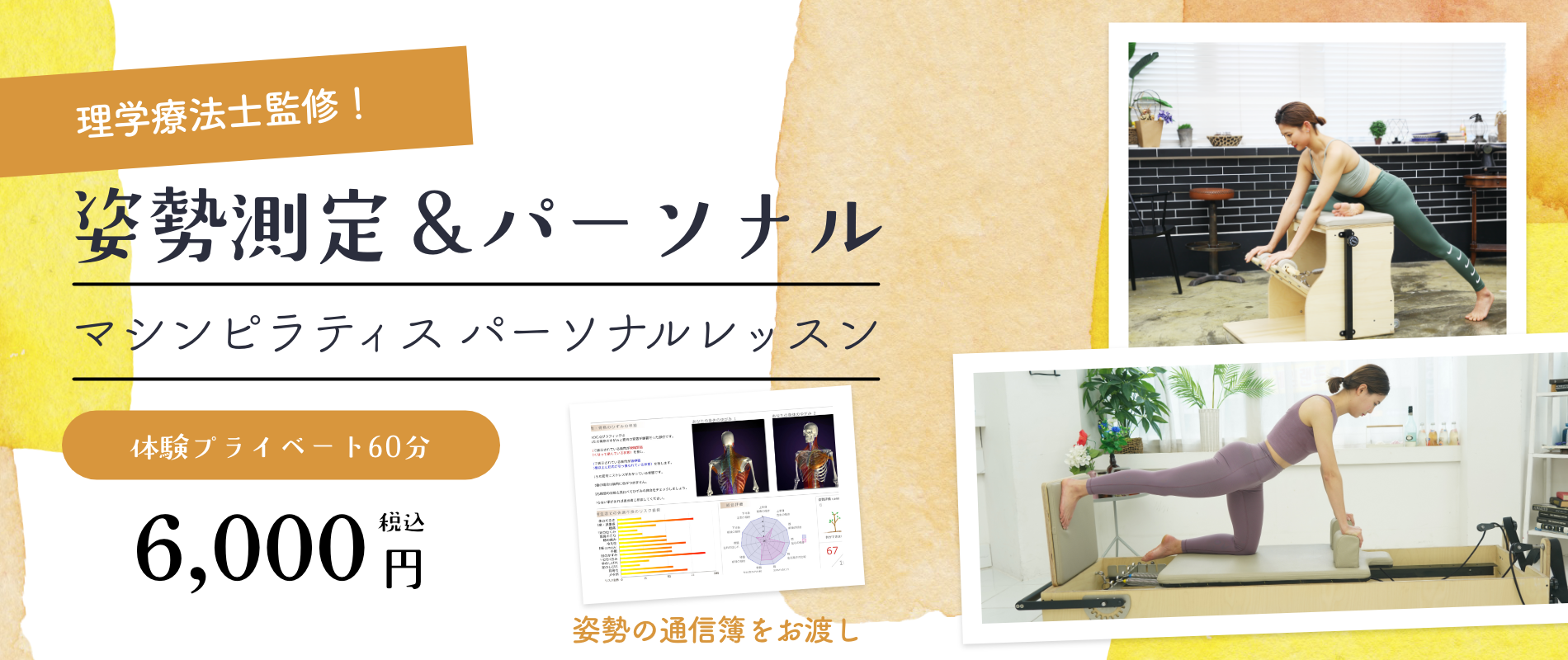 測定機を使用し、姿勢データーを元に身体の歪みを改善し、健康で不調のない綺麗な身体を作ります。パーソナル専用のマシンピラティスなどの道具を使用。グループレッスンが不安、運動が苦手な方にも、楽しみながら行って頂けるような貴方だけのプログラムを考えます。※男性のお客様はご紹介のみ承っております。